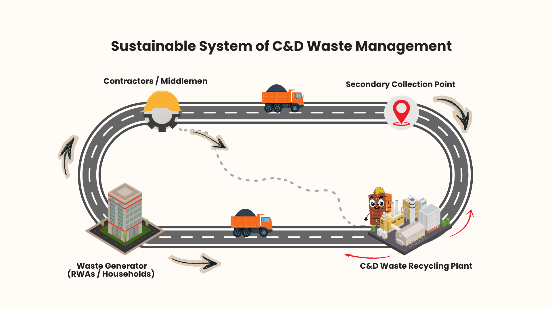 Waste generators (builders, households), Collection and transport agencies, Municipal authorities/ULBs, Recycling plant operators, Informal workers and contractors